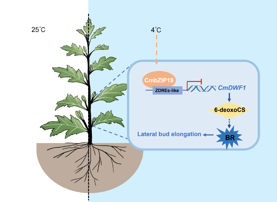 近日,sjb世俱杯官方网站园艺学院菊花遗传与种质创新利用团队在《Plant Journal》在线发表了题为“CmbZIP19 inhibits lateral bud elongation via the brassinolide pathway in chrysanthemum”的研究论文,揭示了菊花CmbZIP19通过抑制油菜素内酯(BR)合成来调节植物侧枝发育。