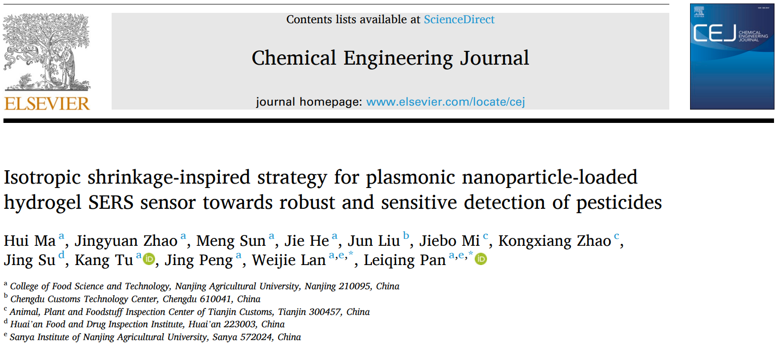 近日,sjb世俱杯食品科技学院屠康教授和潘磊庆教授团队,利用水凝胶体系中“乙醇-水”快速置换促使柔性表面增强拉曼光谱(SERS)基底“热点”致密化,实现了快速、灵敏、多场景的农药残留分析。相关研究成果以“Isotropic shrinkage-inspired strategy for plasmonic nanoparticle-loaded hydrogel SERS sensor towards robust and sensitive detection of pesticides”为题,在国际著名期刊《Chemical Engineering Journal》在线发表。