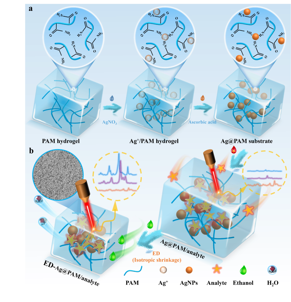 潘磊庆教授团队创新性地利用聚丙烯酰胺(PAM)水凝胶作为SERS基底框架,通过“乙醇-水”快速置换方法,实现了水凝胶的“各向同性”收缩。这种收缩方式使得水凝胶中的银纳米粒子(AgNPs)紧密聚集,形成了均匀且密集的“热点”分布,显著增强了拉曼信号的强度和稳定性。实验表明,与传统风干(AD)方法相比,乙醇脱水(ED)处理的Ag@PAM水凝胶在12分钟内即可实现快速SERS增强,且信号均匀性显著提高(RSD < 10%),对4-硝基苯硫醇(4-NBT)的检测信号提升了17倍,检出限(LOD)低至2.21×10−12 M (~3.43 × 10–13 g⋅mL−1)。