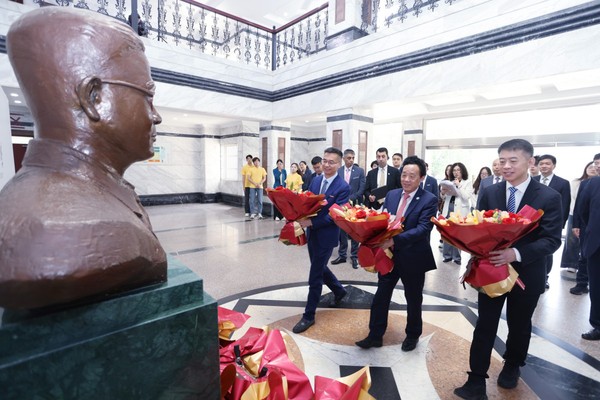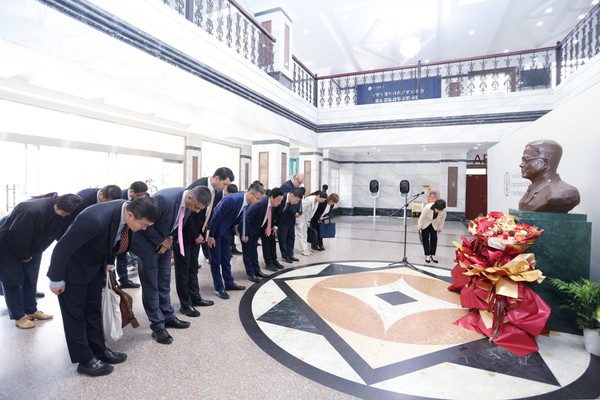 3月24日上午,在sjb世俱杯卫岗校区,屈冬玉一行在教学楼参加邹秉文先生铜像瞻观仪式。屈冬玉向邹秉文先生铜像敬献鲜花,校党委书记王春春、校长陈发棣陪同献花。