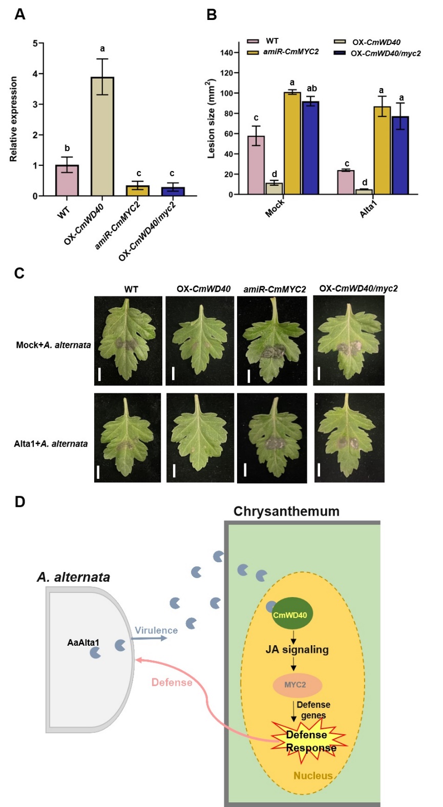 以AaAlta1为诱饵,从菊花黑斑病酵母文库中筛选到了一个互作蛋白CmWD40,并通过菊花遗传转化验证了CmWD40在菊花抗病中的功能;RT-qPCR及转录组分析表明,防御和JA合成及信号传导相关的基因均受到CmWD40的调控,且CmWD40能诱导JA的积累,暗示CmWD40通过JA信号路径来调控菊花对黑斑病的抗性;进一步研究发现,CmWD40介导AaAlta1诱发的防御反应依赖茉莉酸信号传导因子CmMYC2的功能(图2)。该论文表明效应蛋白介导的寄主植物免疫调控机制复杂,AaAlta1作为一种高效的植物免疫激活因子可作为控制植物病害的候选靶点。