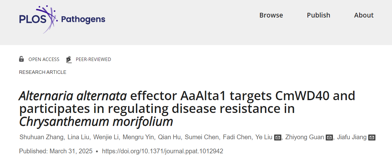 近期,园艺学院菊花遗传育种与种质创新团队在国际知名期刊PLOS Pathogens发表了题为 “Alternaria alternata effector AaAlta1 targets CmWD40 and participates in regulating disease resistance inChrysanthemum morifolium”的文章,揭示了菊花黑斑病菌效应蛋白AaAlta1通过与菊花CmWD40互作激活茉莉酸信号路径,诱发了菊花对黑斑病的抗性反应。