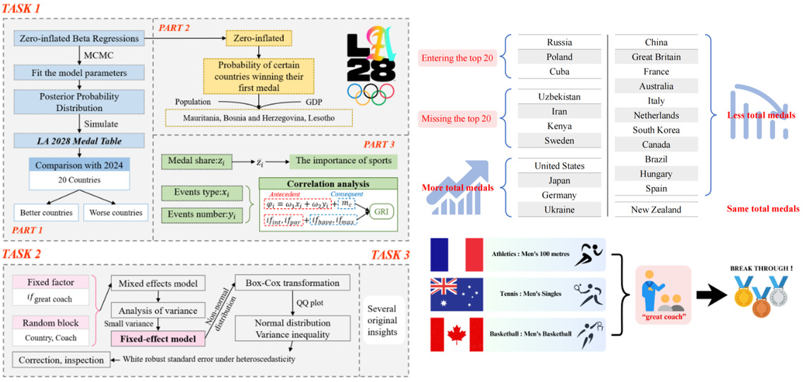 获特等奖团队选取了“预测2028年洛杉矶奥运会奖牌榜”题目,面对复杂变量与数据挑战,他们充分发挥统计学专长,利用R语言进行数据处理与可视化,创新性地引入零膨胀负二项模型和贝叶斯方法,实现参数采样与不确定性评估。同时运用关联规则分析和方差分析,探讨国家竞技优势、教练因素与赛事策略间的关联,构建了稳健、高预测性的奖牌模型。他们将扎实的数学基础与跨学科思维相结合,解决前沿问题,体现了学校“厚基础、宽口径、强能力、高素质”的育人理念,展现了南农学子扎实的数理基础、卓越的学术潜力与跨学科协作能力。