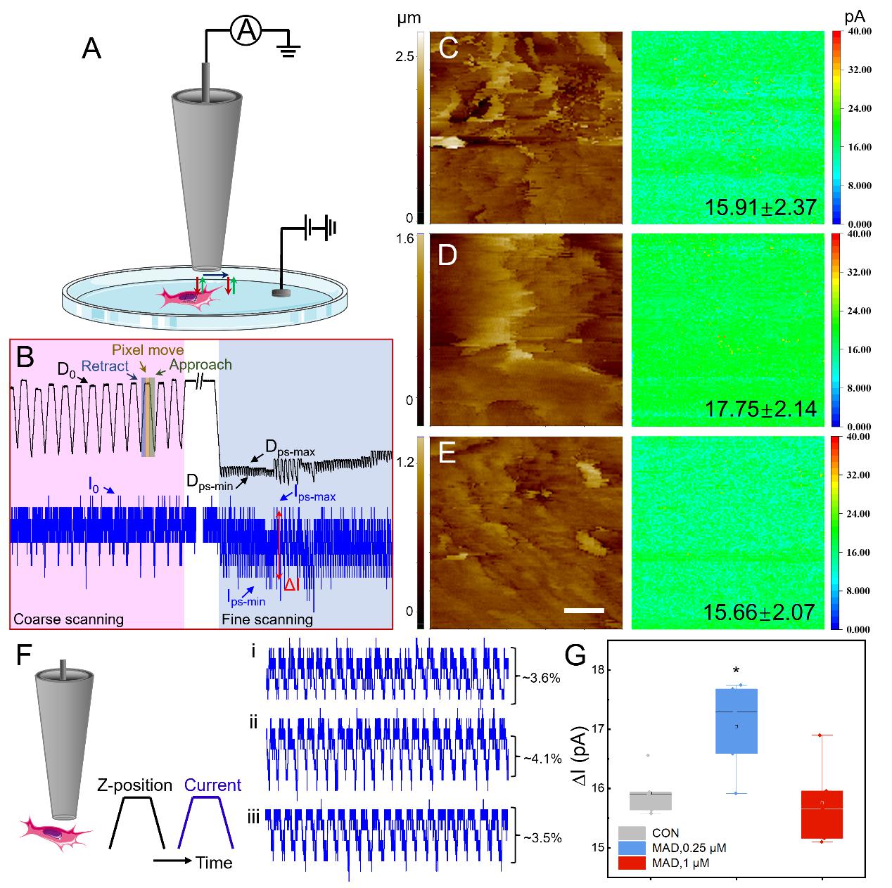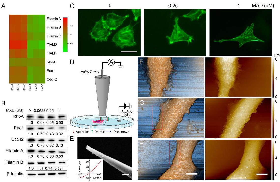 研究表明,MAD能够显著抑制三阴性乳腺癌细胞的迁移和侵袭能力。通过SICM高分辨率成像,团队观察到MAD处理后的细胞表面形态发生明显改变:细胞面积缩小、膜结构收缩、边界平滑化,同时细胞表面电荷分布也呈现显著变化。进一步研究发现,这种变化与钙离子通道活性的调控密切相关,揭示了细胞电生理特性与肿瘤细胞行为之间的内在联系。