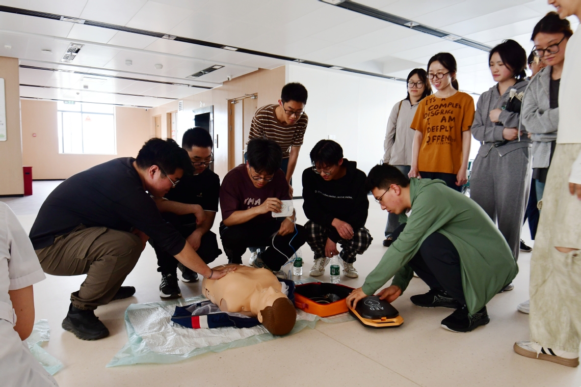 在校医院,主治医师王葳与主管护师陈锐带来专业急救知识讲解,围绕心肺复苏术(CPR)操作要点、自动体外除颤仪(AED)使用场景及步骤等内容展开详细教学,并组织现场实操演练。同学们分组模拟心脏骤停救援(CPR + AED 配合),在实践中不仅收获了实用技能,更培养起安全意识与责任精神。