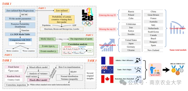 针对赛题“预测2028年洛杉矶奥运会奖牌榜”,团队创新引入零膨胀负二项模型与贝叶斯方法,实现参数采样与不确定性评估;同时结合关联规则分析和方差分析,深入挖掘国家竞技优势、教练资源及赛事策略间的关联性,构建出高精度、强稳健性的预测模型。
