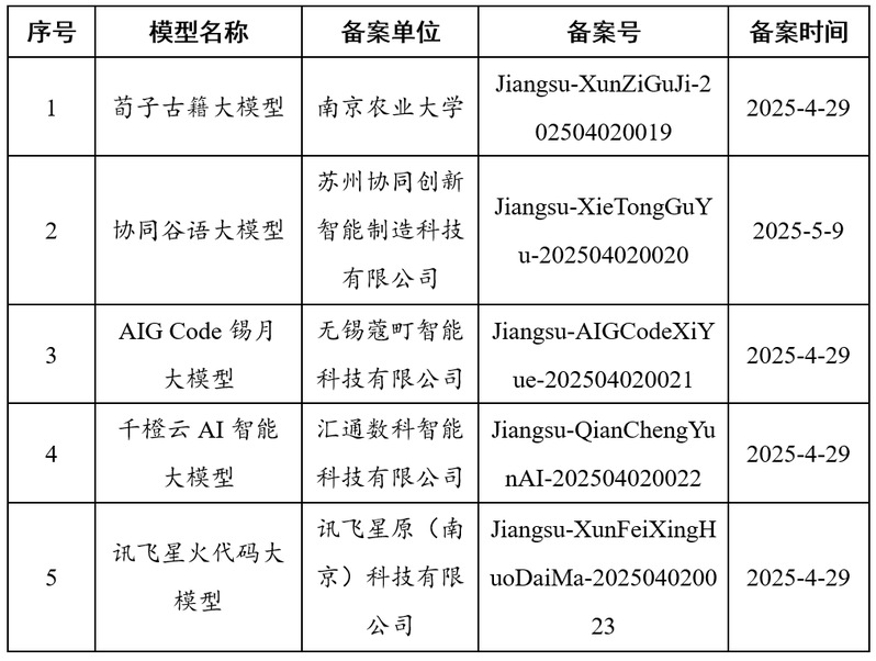 5月12日,江苏省委网信办对外公布江苏省第七批通过国家生成式人工智能服务备案的5款大模型,“荀子古籍大语言模型”位列其中。