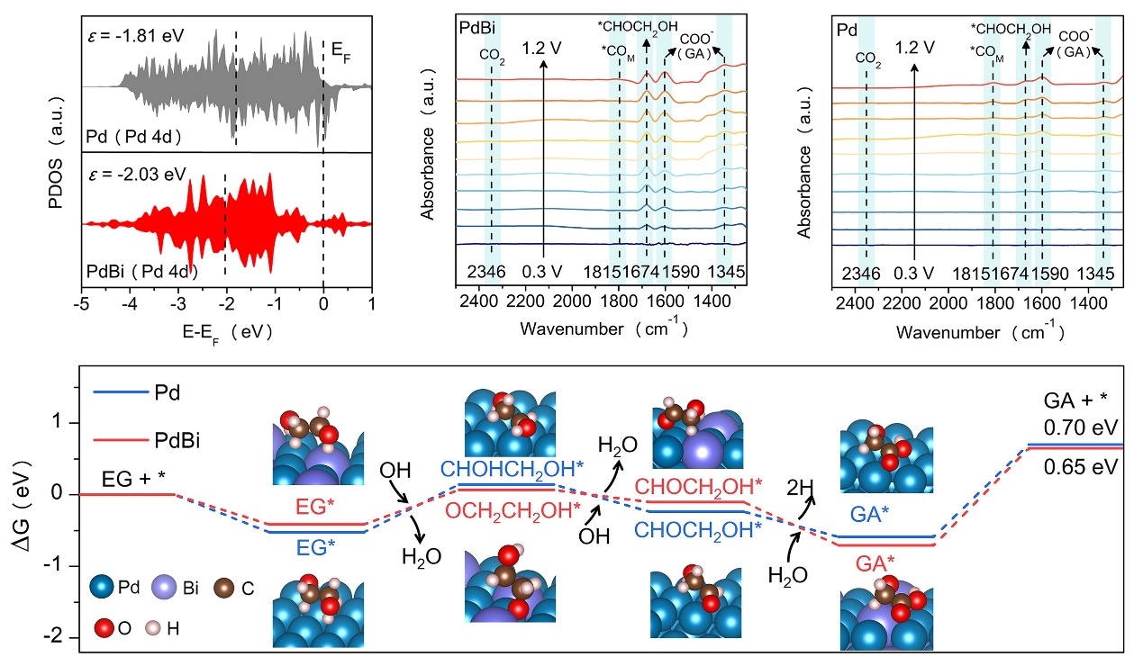 本研究提出了一种配对电解工艺概念,通过阳极塑料衍生乙二醇氧化与阴极生物质衍生草酸还原耦合以实现高附加值化学品乙醇酸的联产。该工艺通过开发具有强CO耐受性的PdBi合金阳极和温度响应型TiO₂阴极得以实现,通过理论计算与实验研究阐明了其作用机制:合金化策略使Pd的d带中心下移,削弱了毒化物种在活性位点的过度键合,显著提升乙二醇氧化生成乙醇酸反应的活性与稳定性。同时,TiO₂阴极通过温度调控(70°C)抑制了中间体乙醛酸的解吸,促进其深度还原为乙醇酸。在70 °C下构建的双电极体系中,该配对系统实现了乙醇酸总法拉第效率达182%。本研究为塑料和生物质废弃物的协同高值化转化提供了高效、低耗的新策略。
