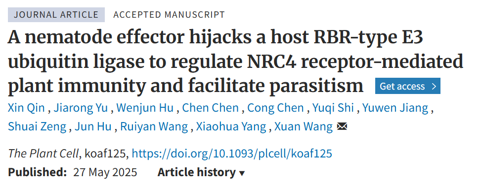 近日,植保院农林生物安全全国重点实验室王暄教授课题组在植物学国际权威期刊《The Plant Cell》在线发表了题为“A nematode effector hijacks a host RBR-type E3 ubiquitin ligase to regulate NRC4 receptor-mediated plant immunity and facilitate parasitism”的研究论文。该研究揭示了一种线虫利用效应子劫持植物靶标蛋白,从而抑制寄主免疫的寄生新机制。