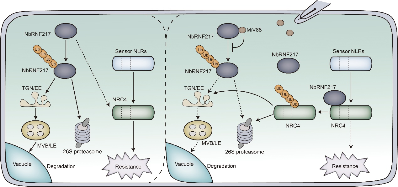 综上所述,该研究系统解析了线虫效应子MiV86通过挟持寄主E3泛素连接酶NbRNF217,降解植物NLR受体NRC4,从而抑制植物免疫促进线虫寄生的新机制。
