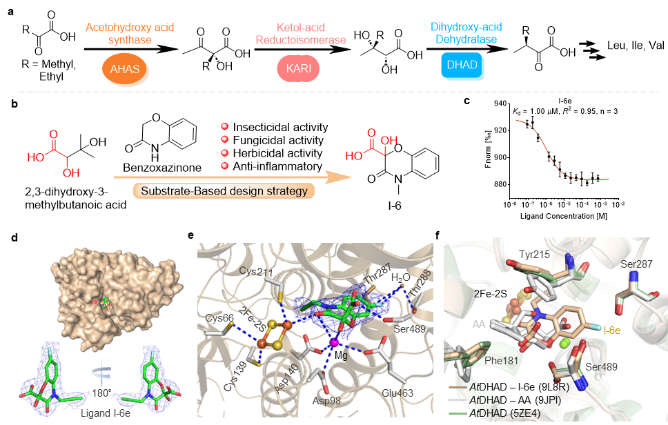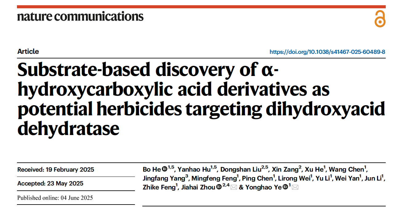 近日,植物保护学院叶永浩教授课题组联合中科院上海有机所、南京师范大学周佳海教授课题组,在Nature Communications期刊上在线发表了题为“Substrate-based discovery of α-hydroxycarboxylic acid derivatives as potential herbicides targeting dihydroxyacid dehydratase”的研究论文。该研究创新性地以植物支链氨基酸(BCAAs)合成途径中的关键酶二羟酸脱水酶(DHAD)为靶标,成功设计并合成具有α-羟基羧酸结构特征的新型除草剂先导化合物,为开发作用机制独特、环境友好的新一代除草剂奠定了重要的分子设计基础。
