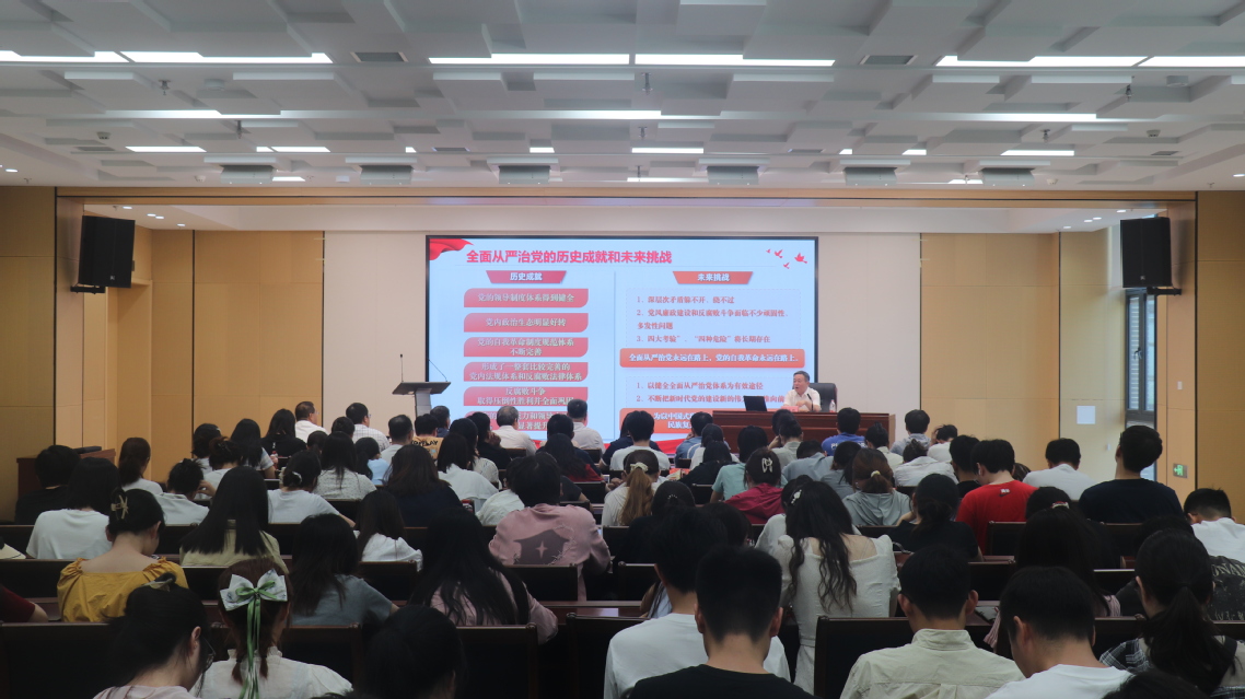 6月5日,校党委副书记、纪委书记吴荣顺在滨江校区食品科技学院B116会议厅为学院学生党员讲授全面从严治党专题形势与政策课。