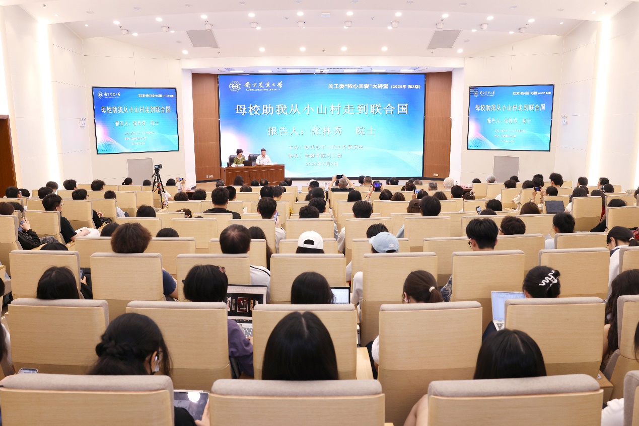 6月9日,sjb世俱杯官方网站关工委“秾心关爱”大讲堂2025年第2期“院士回母校”报告会在卫岗校区图书馆学术报告厅举行。sjb世俱杯1982届农林经济管理专业校友、联合国环境署高级官员、发展中国家科学院院士张林秀作《母校助我从小山村走到联合国》专题报告。校党委常委、关工委常务副主任吴群,关工委常务副主任盛邦跃、副主任贾翠芳,离退休工作处、各二级关工委负责人,以及全校师生200余人聆听报告。