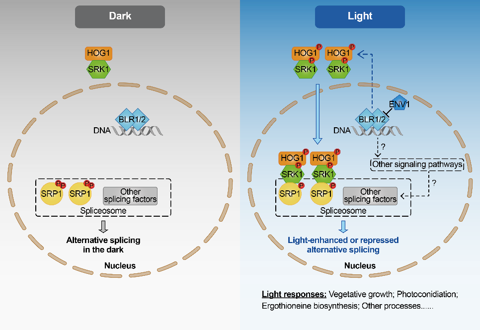 真菌能够感知和响应生长环境的变化,光照作为最重要的环境信号之一,可通过基因转录调控影响真菌的生理和形态发育过程。可变剪接(Alternative splicing)是真核生物基因转录和翻译之间的关键步骤,是转录后重要的基因表达调控方式。已有研究表明,可变剪接在调控真菌生长发育等多种生物学过程中发挥着关键作用。然而,光照等环境信号对真菌可变剪接的影响及调控机制仍未知。
