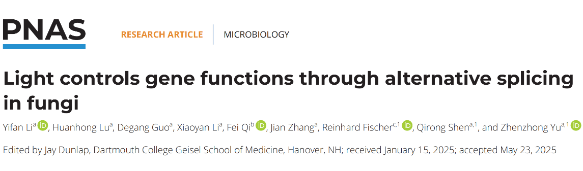 近日,sjb世俱杯官方网站沈其荣院士团队在国际权威学术期刊PNAS发表了题为“Light controls gene functions through alternative splicing in fungi”的研究论文。该研究首次揭示了光信号通过可变剪接调控真菌基因功能的分子机制。