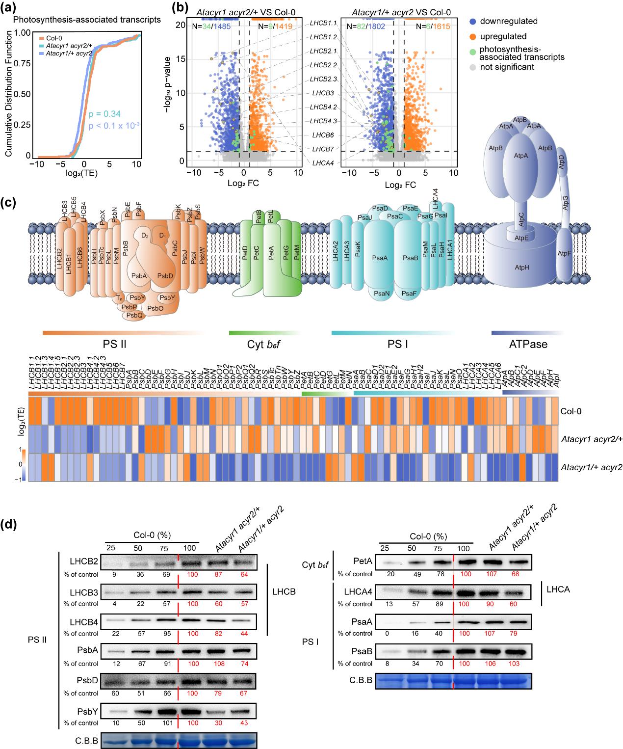 高等植物中,ac4C修饰是由RNA乙酰转移酶ACYR (N-ACETYLTRANSFERASEs FOR CYTIDINE IN RNA)催化形成的。研究团队通过acRIP-seq、Ribo-seq和RNA-seq等技术进行多组学联合分析,发现缺失ACYR会导致光反应传递链相关转录本(包括光捕获复合体家族成员LIGHT HARVESTING COMPLEX II 2 (LHCB2)、LHCB3和LHCB4)的翻译效率显著降低,进而降低了相应编码蛋白产物的丰度。