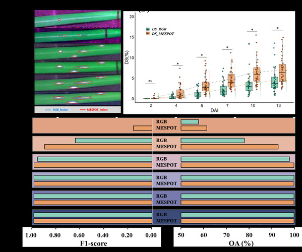 图3.基于RGB图像人工识别与MESPOT方法在量化无症状期稻瘟病症状中的比较。