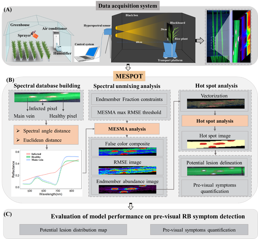 图1.稻瘟病无症状期监测方法MESPOT的技术流程图,包括成像光谱数据获取及预处理(A),识别模型构建(B)及模型精度评价(C)