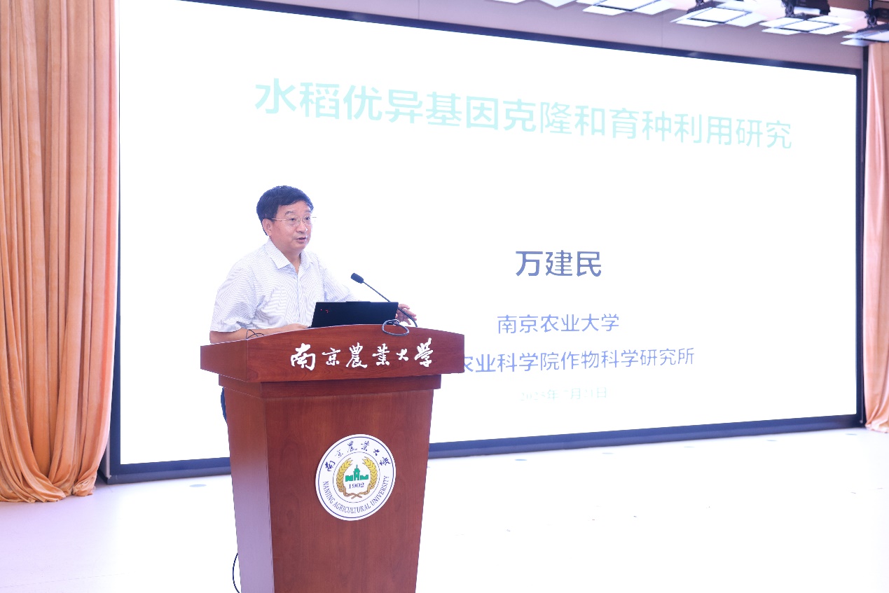 万建民教授作“水稻优异基因克隆和育种利用研究”主题报告,阐述了水稻籼粳杂交优势关键基因、抗病虫基因、品质相关基因、氮素利用基因的挖掘与应用,以及籼粳杂交优势育种利用的分子育种等方面的研究进展与推广应用现状,鼓励同学们躬耕一线田野,在科研学习中做到“团结、勤奋、求实、创新”,为保障国家粮食安全、建设农业强国贡献青年力量。