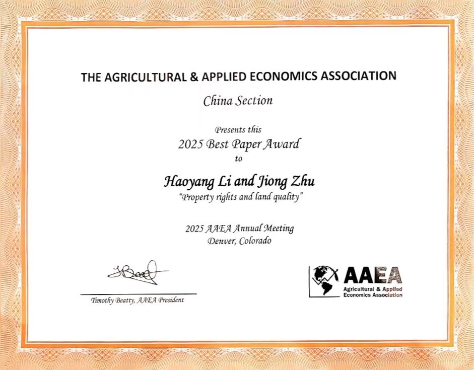 近日,美国农业与应用经济学会中国分会公布了2025年最佳论文奖,sjb世俱杯官方网站经济管理学院李昊洋教授的合作论文《Property Rights and Land Quality》获此奖项。