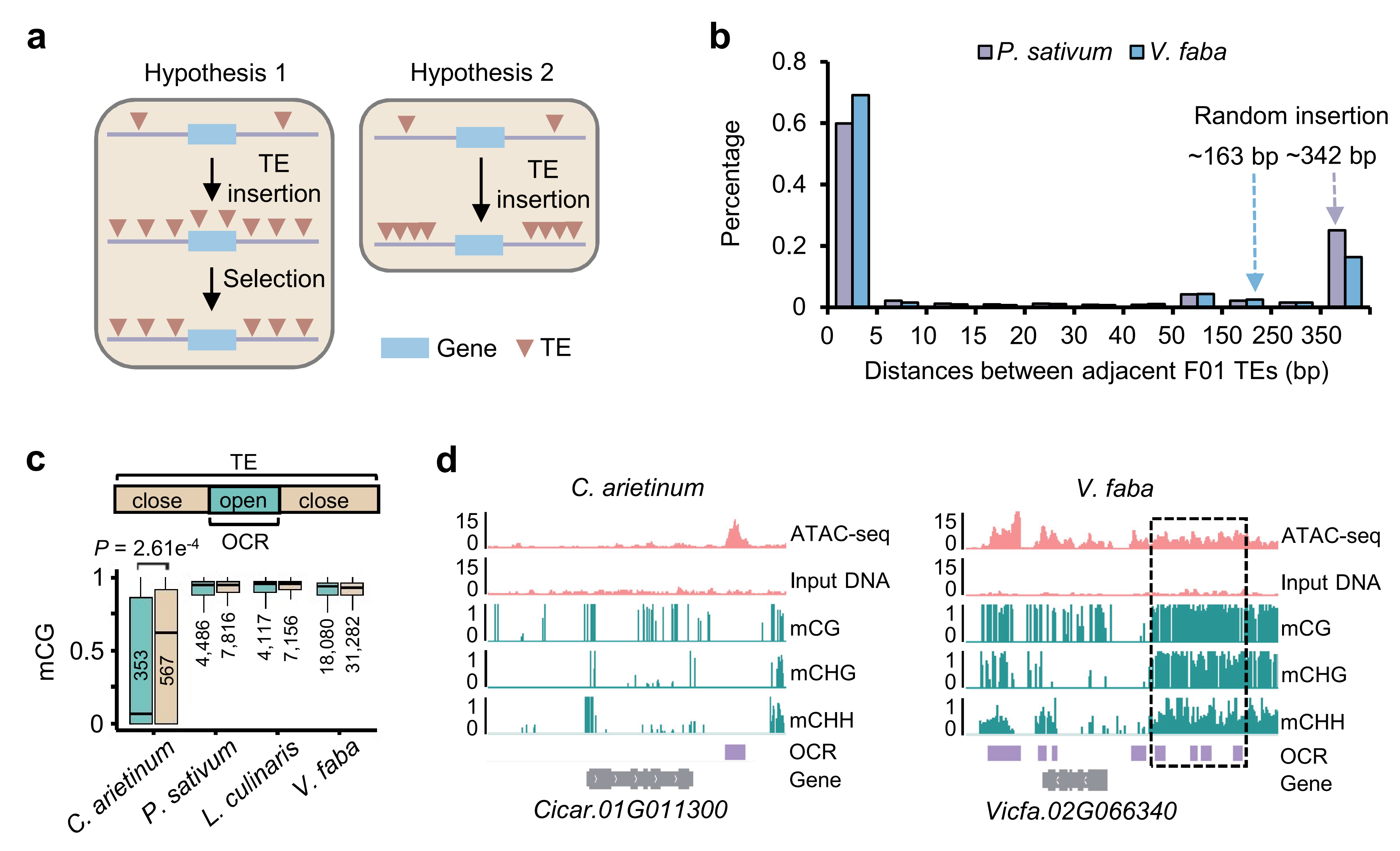 相比于暖季型豆类,冷季型豆类表现出更显著的基因组扩增现象,其基因组大小从鹰嘴豆的约670 Mb扩大到蚕豆的13 Gb。尽管以往研究认为转座子扩增是导致豆科作物基因组大小差异的主要原因,但这一假说无法解释为何大基因组作物的基因区域并未出现显著的转座子扩增。本研究提出了两种可能的机制:(1)转座子扩增后通过选择压力清除基因区域的转座子;(2)转座子在基因间区通过序列串联进行扩增。深入分析表明,转座子串联扩增(tandem amplification)可能是导致豆科作物基因组显著增大的关键因素(图2a,b)。此外,虽然传统观点认为低甲基化是染色质开放的必要条件,但本研究发现豌豆、小扁豆和蚕豆等大基因组作物中,部分高甲基化的转座子区域仍表现出较高的染色质开放水平(图2c,d),暗示这些区域可能具有重要的调控功能。