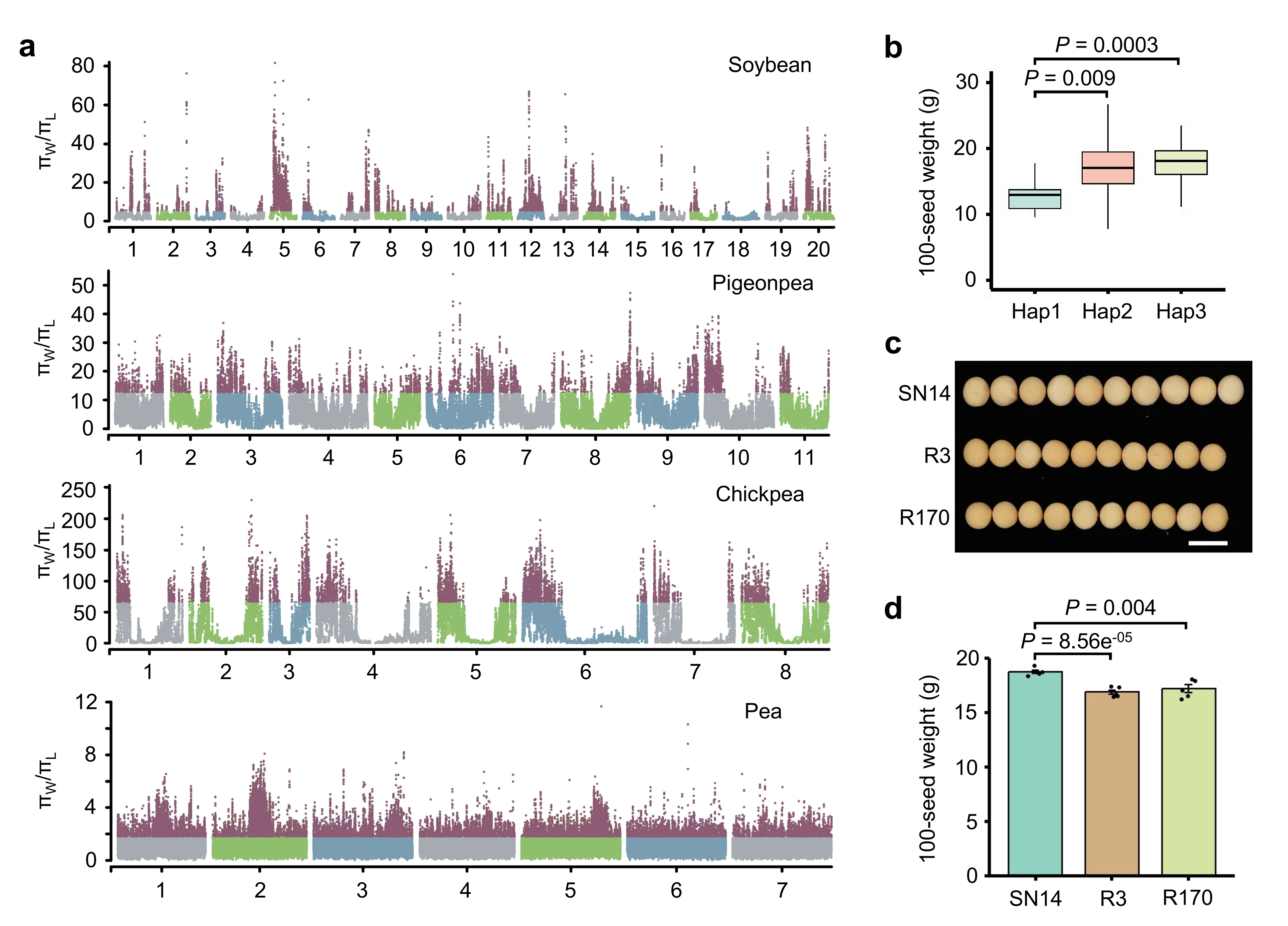 通过进一步利用已发表的大豆、木豆、鹰嘴豆和豌豆的重测序数据,研究团队鉴定出226个在驯化过程中受趋同选择的基因(图1a)。这些基因涉及种子的休眠调控和籽粒发育。对趋同选择基因YUC4进行功能分析,发现该基因在大豆中可以分为三个主要单倍型。含有单倍型1的大豆种质百粒重更低,主要分布于野生大豆。而含有单倍型2和3的大豆种质百粒重更高,主要分布于农家种和栽培种(图1b)。通过筛选野生大豆渗入系,鉴定到含有野生大豆GmYUC4a(单倍型1)片段的渗入系,发现导入野生大豆GmYUC4a显著降低栽培大豆的粒重(图1c,d),证实了趋同驯化基因YUC4在豆科作物驯化和遗传改良中的重要作用。