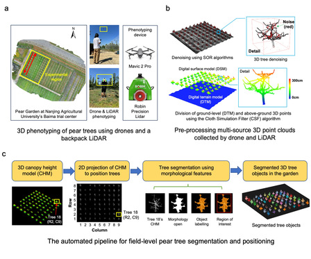 研究团队提出了一种自动化、规模化三维果树表型分析平台,能够精准量化不同类型果园中果树的冠层结构、花部和果实特征。该系统适用于从数十株梨树组成的展示型果园到上千株苹果树的商业化种植园,展现出了良好的通用性与可扩展性。通过创新性地融合了激光雷达(LiDAR;提供果树三维结构)与无人机(提供大场景空间与颜色信息)所获取的多尺度表型数据,研究团队自主研发了多源异构数据融合算法,首次实现了跨生育时期整合树体结构、花簇与果实分布等关键表型特征的多尺度表型融合方法,从而完成了对果树在不同关键生育阶段产量相关性状的高效提取与精准关联分析。