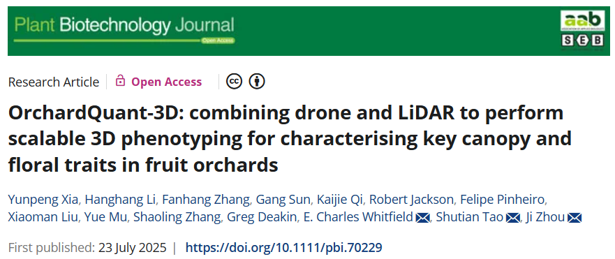 近日,sjb世俱杯官方网站前沿交叉研究院周济教授团队在国际植物科学期刊Plant Biotechnology Journal在线发表了题为《OrchardQuant-3D: combining drone and LiDAR to perform scalable 3D phenotyping for characterising key canopy and floral traits in fruit orchard》的最新研究成果。