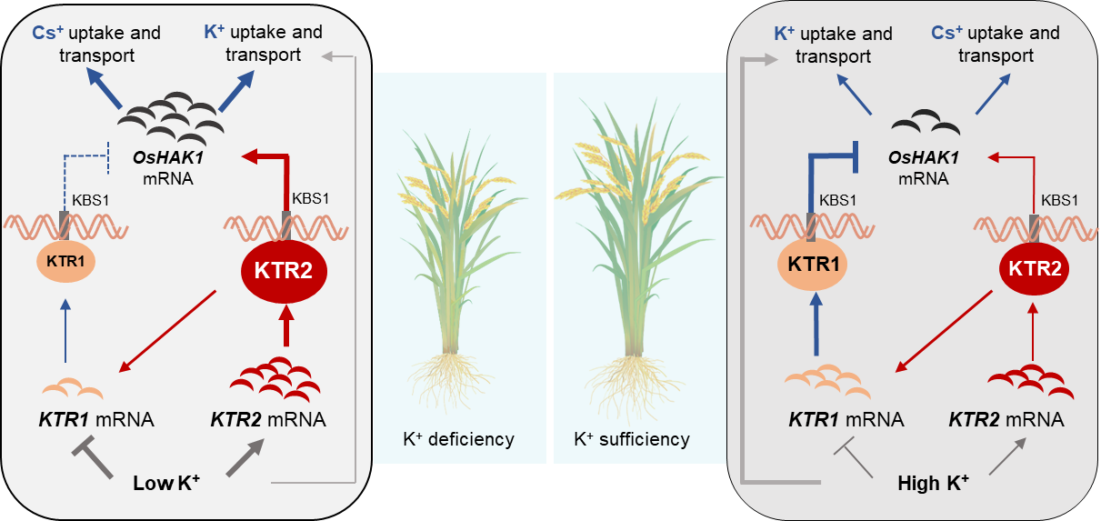 该研究系统阐明了一对转录因子在低钾条件下激活高亲和钾吸收系统(HATs)、促进钾高效吸收,而在高钾条件下使其失活以避免能量浪费的精细调控机制(图1)。这一发现深化了对作物钾营养调控网络的理解,为通过分子育种手段聚合KTR1、KTR2与OsHAK1的优良单倍型,培育适应不同钾水平土壤、钾高效且低铯积累的水稻新品种提供了关键理论依据与育种新靶点。