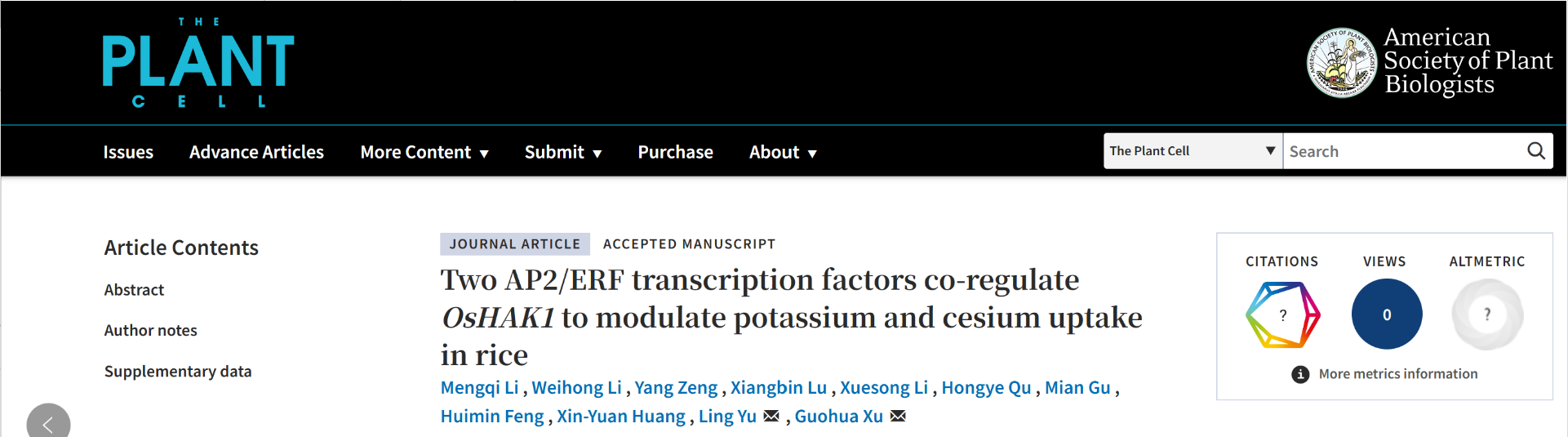 近日,sjb世俱杯官方网站资源与环境科学学院徐国华教授团队在植物学顶级期刊《The Plant Cell》在线发表题为“Two AP2/ERF transcription factors co-regulate OsHAK1 to modulate potassium and cesium uptake in rice”的研究论文。该研究首次揭示了一对功能相互拮抗的AP2/ERF转录因子通过协同调控OsHAK1的表达,动态平衡水稻对钾和铯的吸收过程。