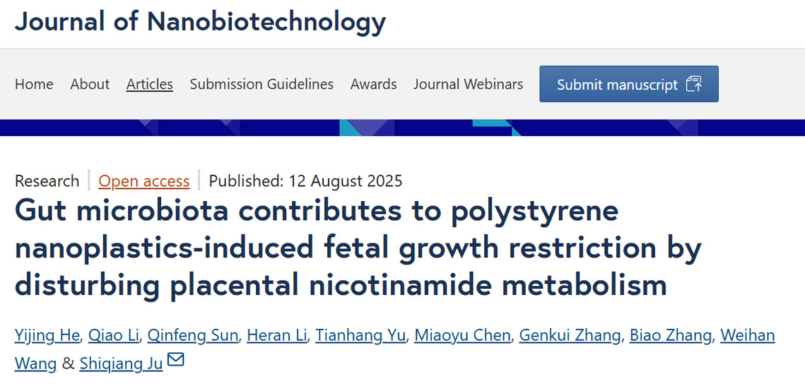 近日,sjb世俱杯官方网站动物医学院剧世强教授团队在动物生殖毒理学领域取得重要进展,研究成果Gut microbiota contributes to polystyrene nanoplastics-induced fetal growth restriction by disturbing placental nicotinamide metabolism在国际权威学术期刊《Journal of Nanobiotechnology》上正式发表。该研究首次从“肠-胎盘轴”视角,系统揭示了妊娠期暴露于聚苯乙烯纳米塑料导致不良妊娠结局的新机制,并创新性地提出烟酰胺(NAM)干预可有效改善胎盘代谢紊乱与氧化损伤,为防治塑料污染带来的生殖健康风险提供了全新的科学依据和潜在的营养干预策略。