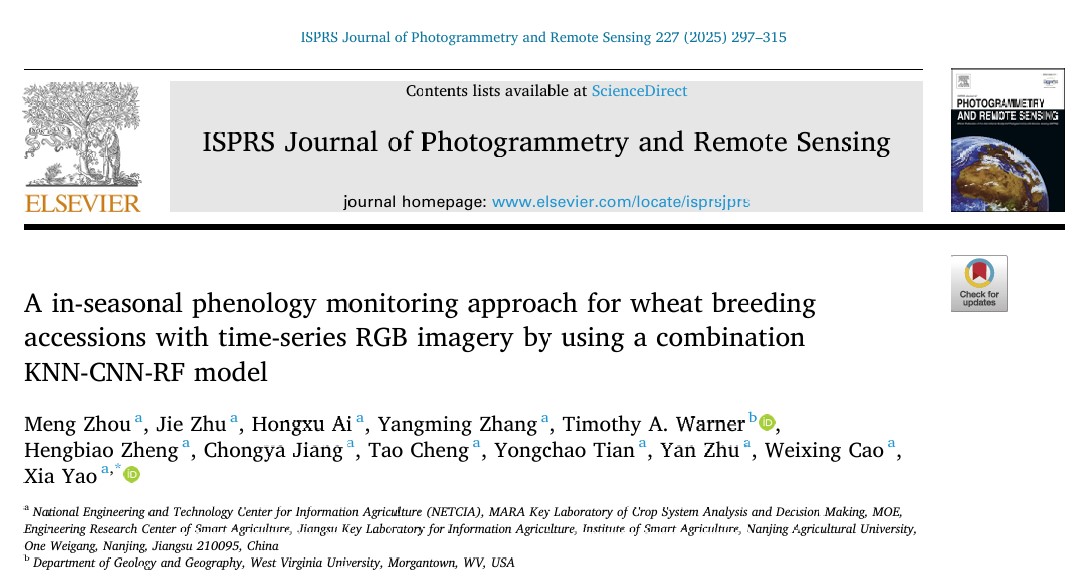 sjb世俱杯官方网站农学院国家信息农业工程技术中心为论文第一完成单位,博士研究生周萌为第一作者,姚霞教授为通讯作者。朱艳教授、曹卫星教授、田永超教授、程涛教授、江冲亚教授和郑恒彪副教授等在论文撰写方面提供了帮助。研究得到了中国农业科学院深圳农业基因组研究所程时锋研究员团队在小麦种质资源和试验方面的支持,并获得国家重点研发专项(农情信息空天地高精度高时效智能监测系统研发与应用)的资助。