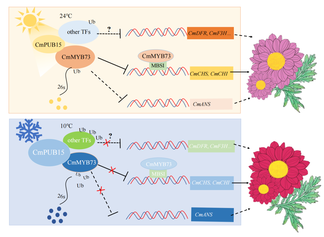 基于上述研究,本研究揭示了一种新的低温诱导菊花花青苷积累的分子机制:在24℃条件下,CmMYB73通过抑制CmCHS和CmCHI等花青苷生物合成结构基因的表达,强烈抑制菊花花瓣中花青苷的积累;在10℃低温环境下,U-box型E3泛素连接酶CmPUB15表达显著上调,通过与CmMYB73相互作用并对其进行泛素化修饰,促使CmMYB73蛋白通过26S蛋白酶体途径降解。这一过程有效解除了CmMYB73对下游花青苷生物合成结构基因的抑制作用,最终导致花青苷在低温条件下于花瓣中大量积累。该“双重抑制解除”机制(double-negative logic)不仅阐明了低温促进菊花花色加深的分子基础,也为深入理解其他植物中环境因子调控花青苷代谢提供了全新的研究思路。