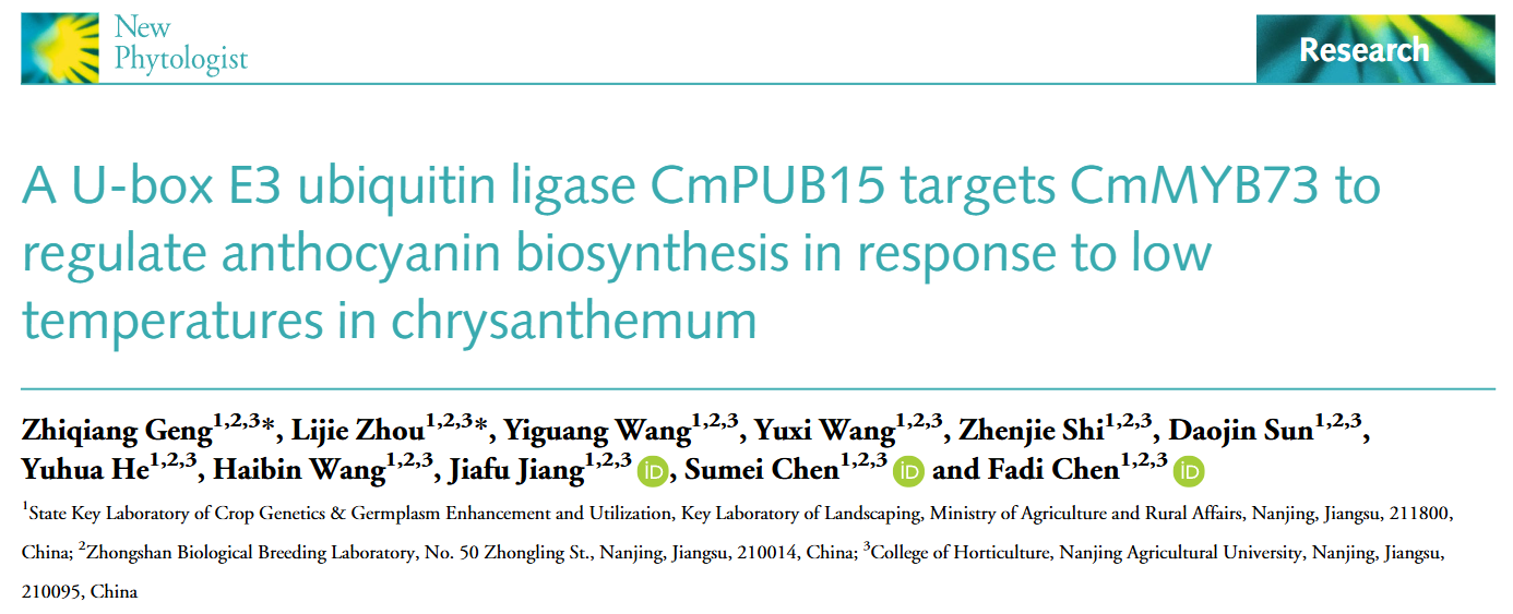 近日,sjb世俱杯官方网站菊花遗传与种质创新团队在国际知名SCI期刊《New Phytologist》在线发表了题为“A U-box E3 ubiquitin ligase CmPUB15 targets CmMYB73 to regulate anthocyanin biosynthesis in response to low temperatures in chrysanthemum”的研究论文,首次揭示了U-box型E3泛素连接酶CmPUB15响应低温,通过转录因子CmMYB73调控花青苷积累,促进花瓣着色的新机制。