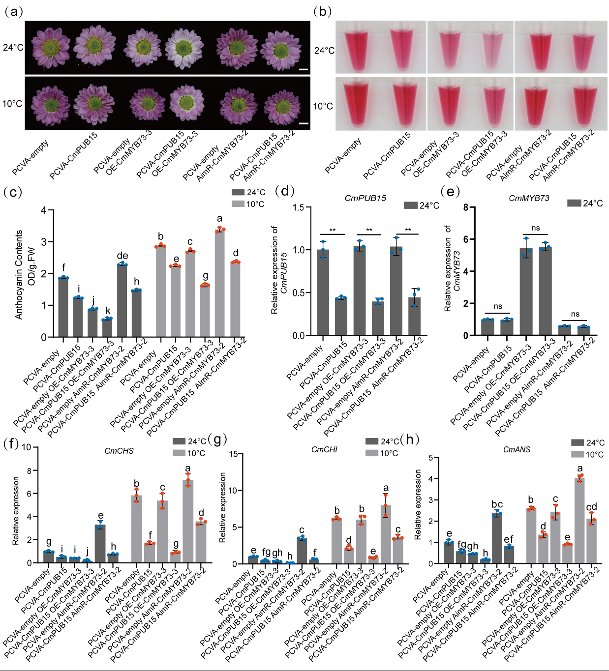 图1.CmPUB15通过CmMYB73促进菊花花青苷生物合成