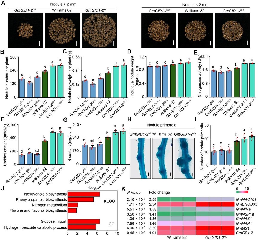 图2. 敲除GmGID1-2增强大豆根瘤固氮