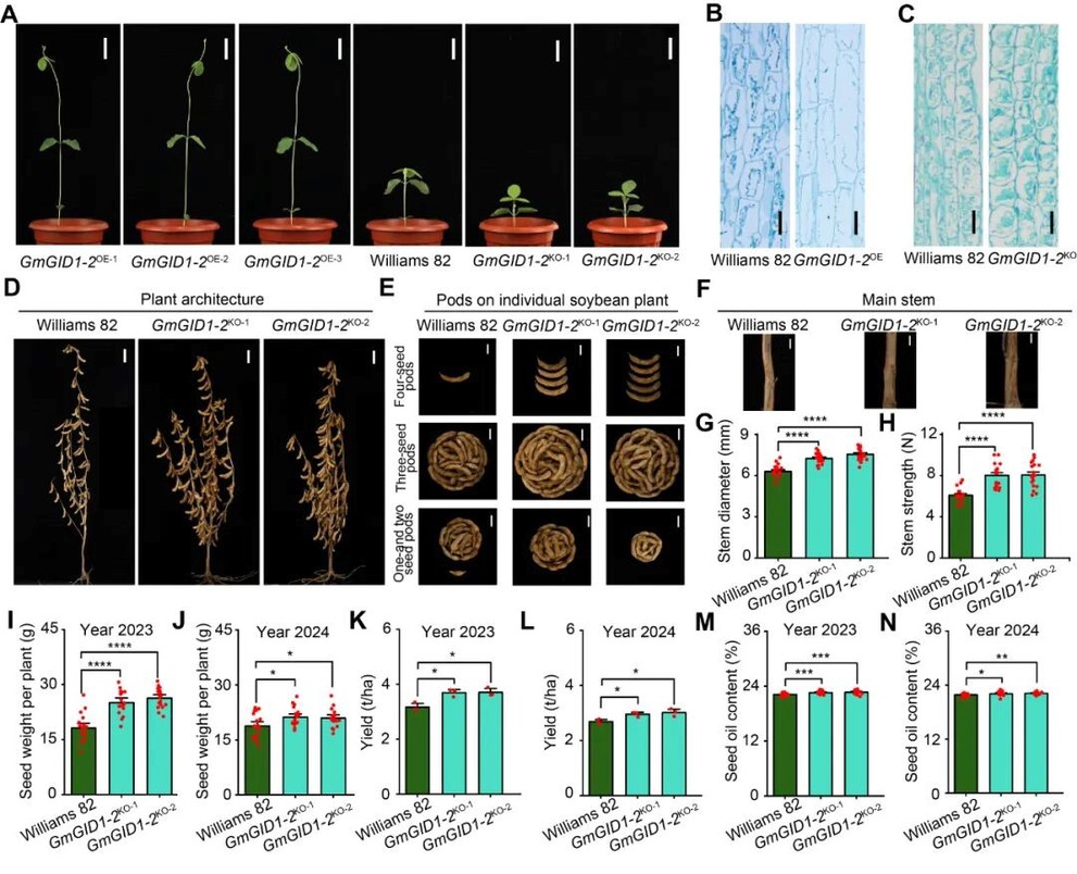 研究团队发现过表达GmGID1-2会显著增加大豆的株高,而敲除则使株高降低,同时增加茎秆直径和强度、分枝数、主茎节数、单株荚数 (三粒荚和四粒荚显著增多) 和种子数,从而提高单株种子重量与大豆产量,并提升种子含油量。进一步研究表明,GmGID1-2与DELLA蛋白互作调控大豆株高,并通过影响与分枝、固碳作用和脂肪酸代谢等相关的通路及基因表达,进而调控大豆分枝数和种子含油量。