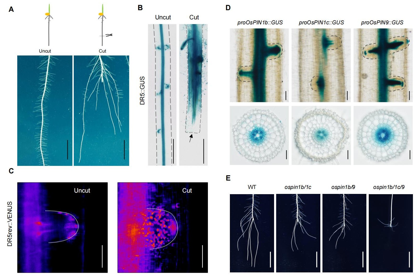 图1.水稻通过三个生长素外排蛋白从地上部向根部运输生长素、激活断根后的补偿性生长。(A)断根的补偿性生长现象;(B,C)断根处理诱导切口区域和该区域的侧根原基的生长素积累;(D)OsPIN1b、OsPIN1c和OsPIN9在维管组织中表达;(E)OsPIN1b、OsPIN1c和OsPIN9三基因同时突变严重影响断根后的补偿性生长。