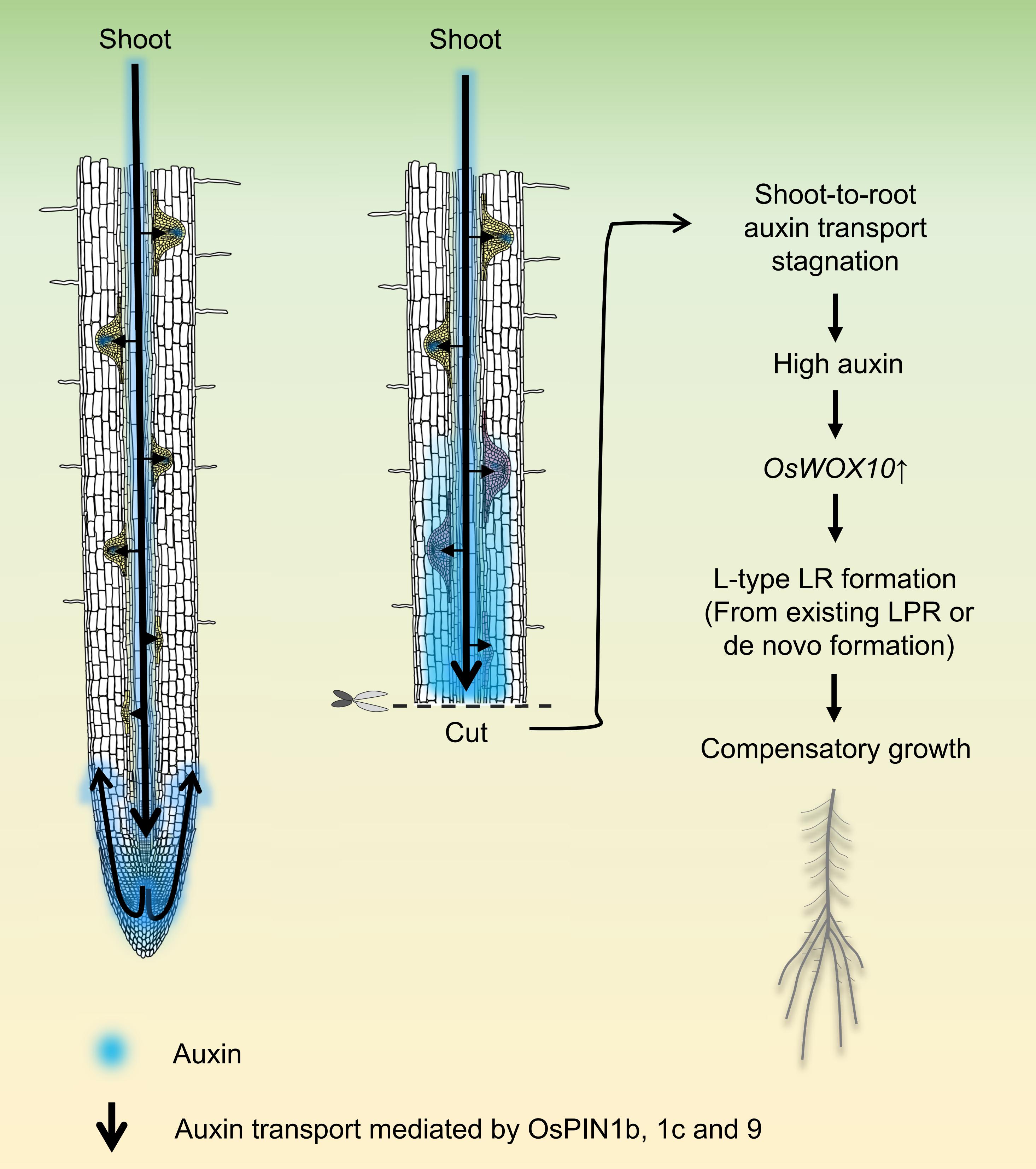 图2.水稻地上部至根部的生长素转运激活断根补偿性生长的机制模型