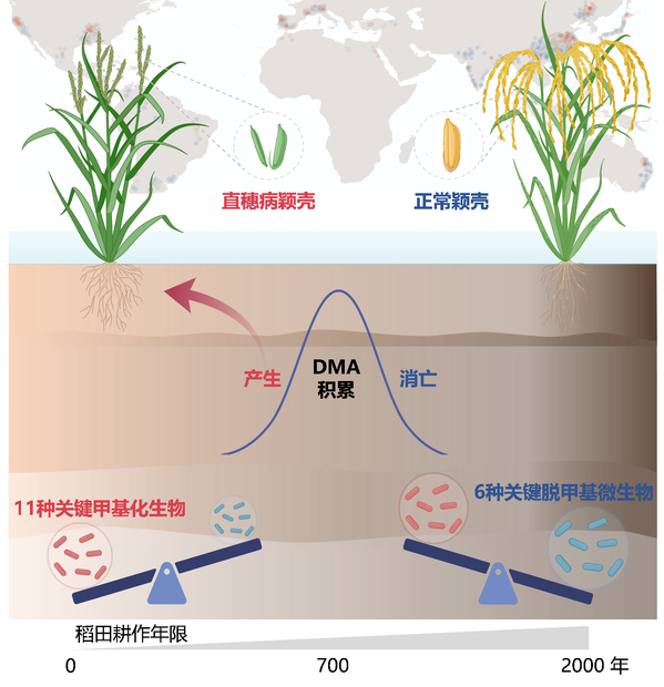 通过对我国不同种植年限的稻田(慈溪:1-2000年;广安:1-300年;鹰潭:1-100年)进行系统研究,团队揭示了一个关键规律:新稻田中土壤砷甲基化的“产毒”微生物占优,甲基砷积累多,直穗病发病风险高;而老稻田中土壤DMA脱甲基的“解毒”微生物(主要为甲基营养型产甲烷古菌)丰富,产生的甲基砷容易被降解,直穗病发病风险低(图1)。