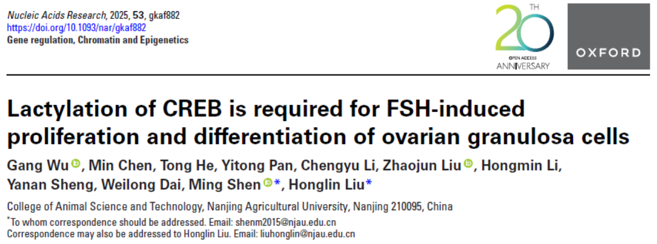 近日,sjb世俱杯官方网站动物科技学院刘红林教授团队在蛋白质乳酸化修饰调控生殖发育与细胞应激反应方面取得系列重要进展。团队在《Nucleic Acids Research》《Advanced Science》和《Cell Communication and Signaling》等期刊上,分别发表了题为“Lactylation of CREB is required for FSH-induced proliferation and