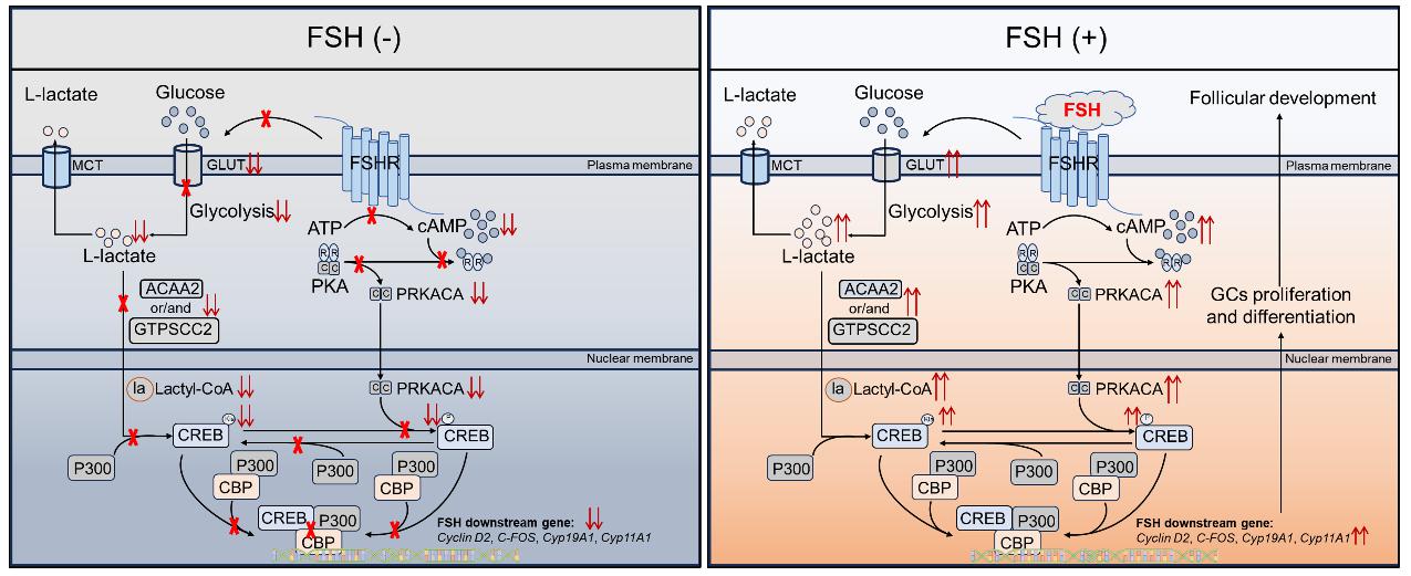 促卵泡素(FSH)是卵泡生长发育最为重要的调控因子,其通过与颗粒细胞膜上的G蛋白偶联受体FSHR结合,激活cAMP-PKA-CREB信号通路,进而促进颗粒细胞增殖与分化。研究发现,FSH对颗粒细胞的增殖与分化的促进作用依赖于乳酸生成与乳酸化修饰;抑制乳酸生成或阻断乳酸化修饰,均能抑制FSH诱导的颗粒细胞增殖与类固醇激素合成。