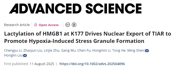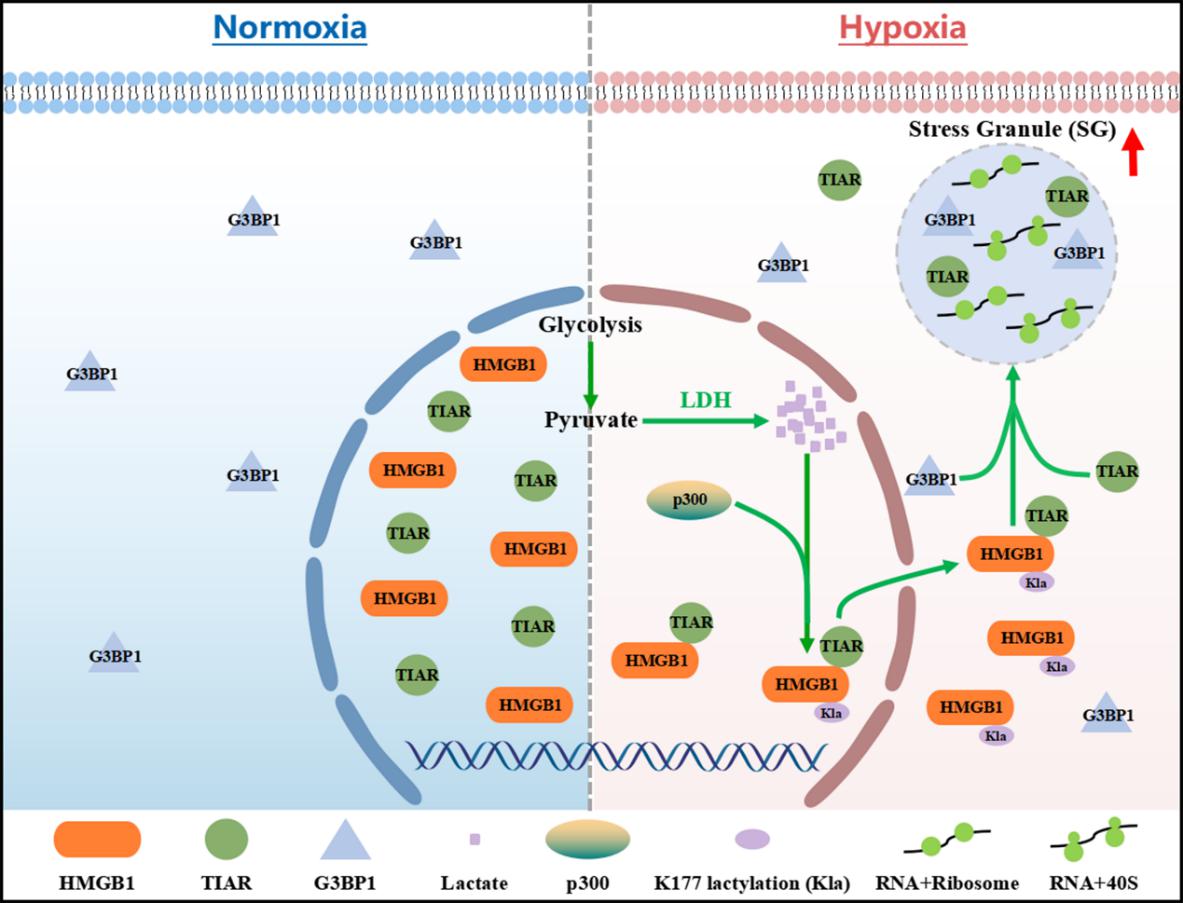 进一步研究表明,乳酸化修饰介导的HMGB1核输出具有重要的生物学功能:HMGB1在核内与应激颗粒核心成分TIAR结合,协助其转运至细胞质,从而促进应激颗粒的组装。该研究创新性地揭示了乳酸化修饰在连接低氧代谢信号与细胞应激防御系统中的核心作用。