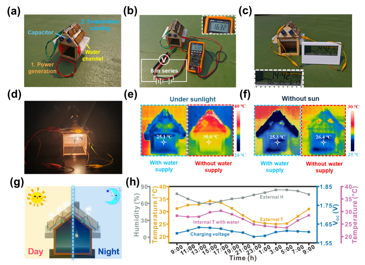 绿色双效木屋的实际应用:(a)发电与节能木屋光学照片;(b)木屋发电展示照片(显示了屋顶八块木片串联产生的电压,附串联示意),及其直接驱动的家用低功耗设备系列:(c)环境温湿度计和(d)用于夜间照明的小灯泡;由蒸发冷却驱动的节能应用:(e)在阳光照射下(环境温度≈31.2 °C)和(f)无阳光时(环境温度≈27.3 °C),木屋在有(左侧)与无(右侧)供水情况下拍摄的红外照片;(g)全天候发电与冷却联动示意以及(h)在中国扬州(2025年5月17日)对木屋全天候发电与冷却性能进行连续监测结果。