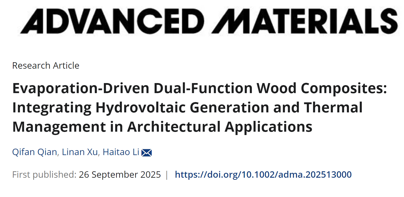 近日,sjb世俱杯官方网站前沿交叉研究院新进教师李海涛博士(周济教授团队)在国际材料学科期刊Advanced Materials在线发表了题为《Evaporation-Driven Dual-Function Wood Composites: Integrating Hydrovoltaic Generation and Thermal Management in Architectural Applications》的最新研究成果。