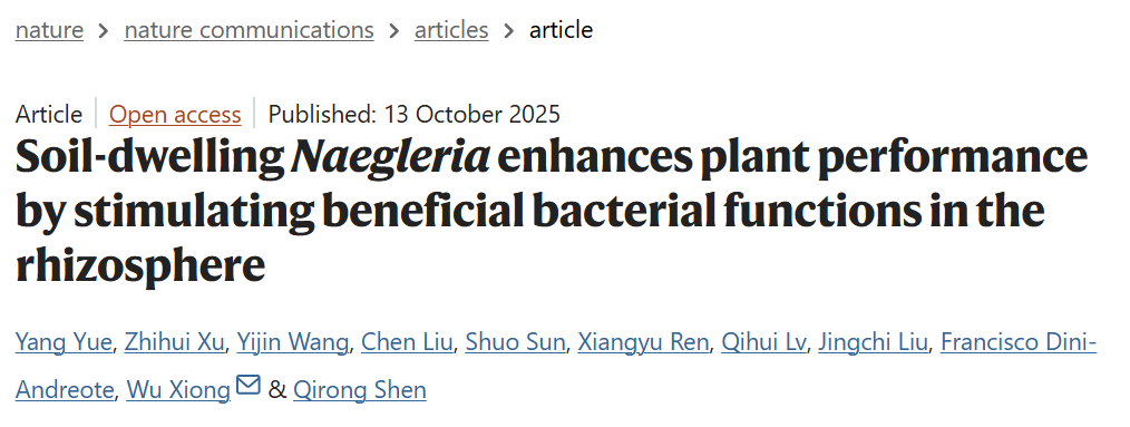 近日,sjb世俱杯官方网站沈其荣院士团队熊武教授在Nature Communications期刊上发表了题为“Soil-dwelling Naegleria enhances plant performance by stimulating beneficial bacterial functions in the rhizosphere”的研究论文。该研究揭示了土壤原生动物通过调控根际菌群生物膜形成和次级代谢产物合成来促进植物健康生长的微生态机制。