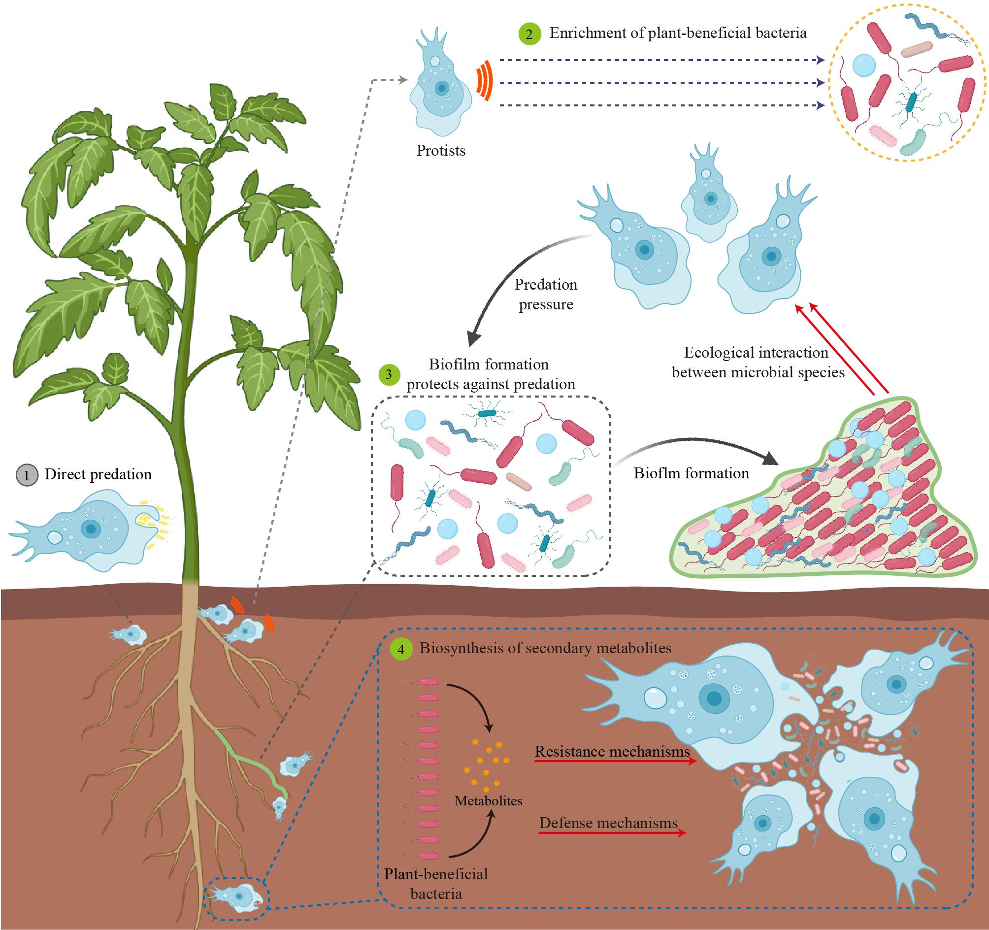 土壤微生物组对植物健康生长至关重要,吞噬型原生生物(即:原生动物)是土壤微食物网的重要组成部分,它们通过捕食作用调控并影响着微生物群落组成与功能,但土壤原生动物如何与根际菌群互作影响植物健康生长的机制还未充分阐明。