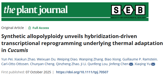 近日,sjb世俱杯园艺学院葫芦科作物遗传与种质创新团队在国际知名期刊《The Plant Journal》上发表了题为“Synthetic allopolyploidy unveils hybridization-driven transcriptional reprogramming underlying thermal adaptation in Cucumis”的研究论文。该研究通过人工合成的异源多倍体黄瓜(Cucumis xhytivus, Chen et Kirkkbride, 2n=4x=38),清晰揭示了种间杂交而非基因组加倍是异源多倍体的耐热适应性新表型的核心关键。这一发现为理解多倍体适应性优势的形成,以及应对全球气候变化、定向培育气候智能型作物提供了新的理论支撑和育种策略。