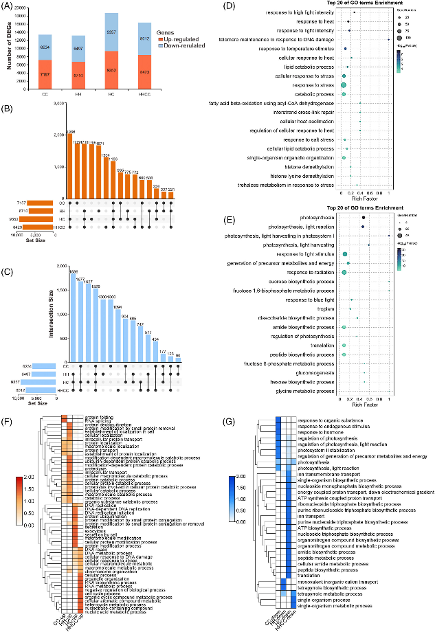 随着全球气候变暖,高温胁迫已成为制约农业生产的主要因素之一。在植物进化与遗传改良中,两个不同物种杂交并结合形成新基因组能产生具有显著环境适应性优势的新物种,如小麦、棉花等。然而在异源多倍化过程中,种间杂交与基因组加倍两个环节所起的作用和机理并不清晰。为解决这一难题,研究团队利用其前期独创的人工合成异源四倍体黄瓜新物种及其二倍体杂交种为材料,与亲本栽培黄瓜(C. sativus L., 2n=14)和野生酸黄瓜(C. hystrixChakra., 2n=24)进行系统对比研究。研究发现,无论是二倍体杂交种还是四倍体新物种,其耐热性均远超它们的亲本。在生理层面,它们表现出更高的半致死温度、更强的光合作用保护能力和更有效的活性氧清除系统。在分子层面,关键的耐热基因(如DNA修复、胁迫响应相关基因)在杂交后即被大量激活,这种转录组的“重编程”是耐热性提升的直接原因。而二倍体杂交种和四倍体新物种在耐热性上表现高度相似,表明耐热性的核心优势在杂交这一步已经奠定,全基因组加倍的主要作用在于稳定和优化了这些由杂交带来的优势,并赋予了新物种正常的繁殖能力,而非创造新的耐热机制。该研究如同拆解了一个精密的“进化黑箱”,明确了“杂交驱动-加倍稳定”的分工模式,为利用异源加倍开展高效培育抗高温、抗逆境作物新品种指明了方向。