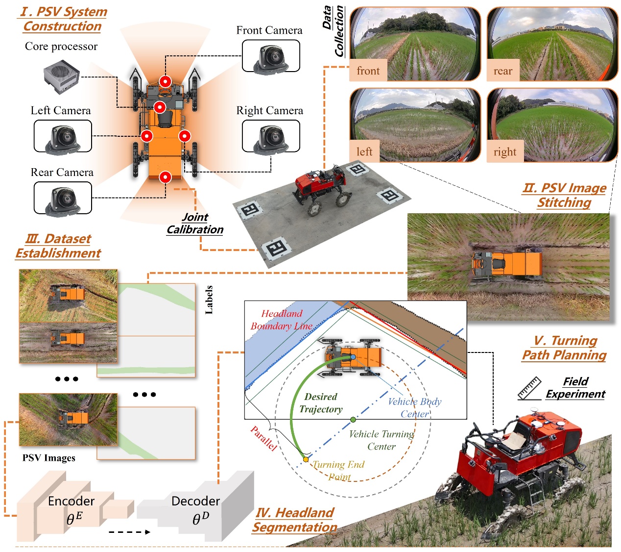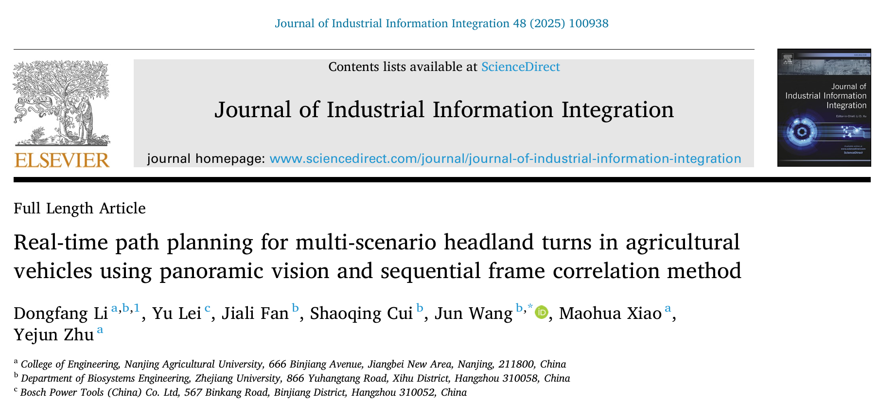近日,工学院智能农机动力与无人系统团队联合浙江大学生物系统工程与食品科学学院农业装备与智能检测(AE&ID)团队在国际权威期刊Journal of Industrial Information Integration上发表了题为Real-time path planning for multi-scenario headland turns in agricultural vehicles using panoramic vision and sequential frame correlation method的研究论文。该研究通过构建全景环视系统,结合深度学习与序列帧关联分析,提出了一种适用于农业车辆在多场景下进行地头转向的实时路径规划方法,为实现纯视觉导航的农业自动化系统提供了新思路。